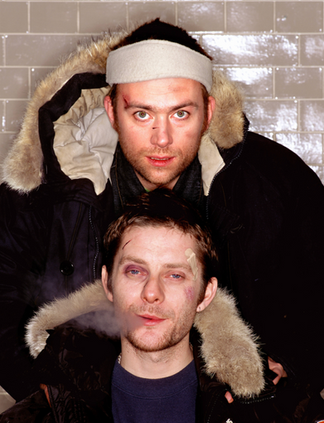 The fictional band and their creators [R to L]: Noodle [guitar], 2D [vocals], Russel [drums], Murdoc [bass]; [center] Damon Albarn [musican] and Jamie Hewlett [artist]